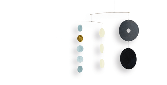 Die einzelnen Elemente bestehen aus hochwertigem, durchgefärbtem Karton, der mit lichtechten Farben handbemalt bzw. mit Blattgold versehen wurde. Das Mobilé ist mit einem ausreichend langen Faden und einer Aufhängung versehen. Eine Lackierung erleichtert das Reinigen mit einem trockenen Tuch.
